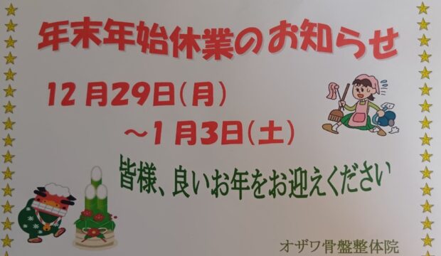 ☆お正月休みのお知らせ 2025.11.30 12月29日(月)~1月3日(土)まで連休させて頂きます。ご不便をお掛けしますがよろしくお願いいたします。 記事のタイトルとURLをコピーする ★昭和63年開院。以来お蔭様で38年目を迎えました。 前の記事